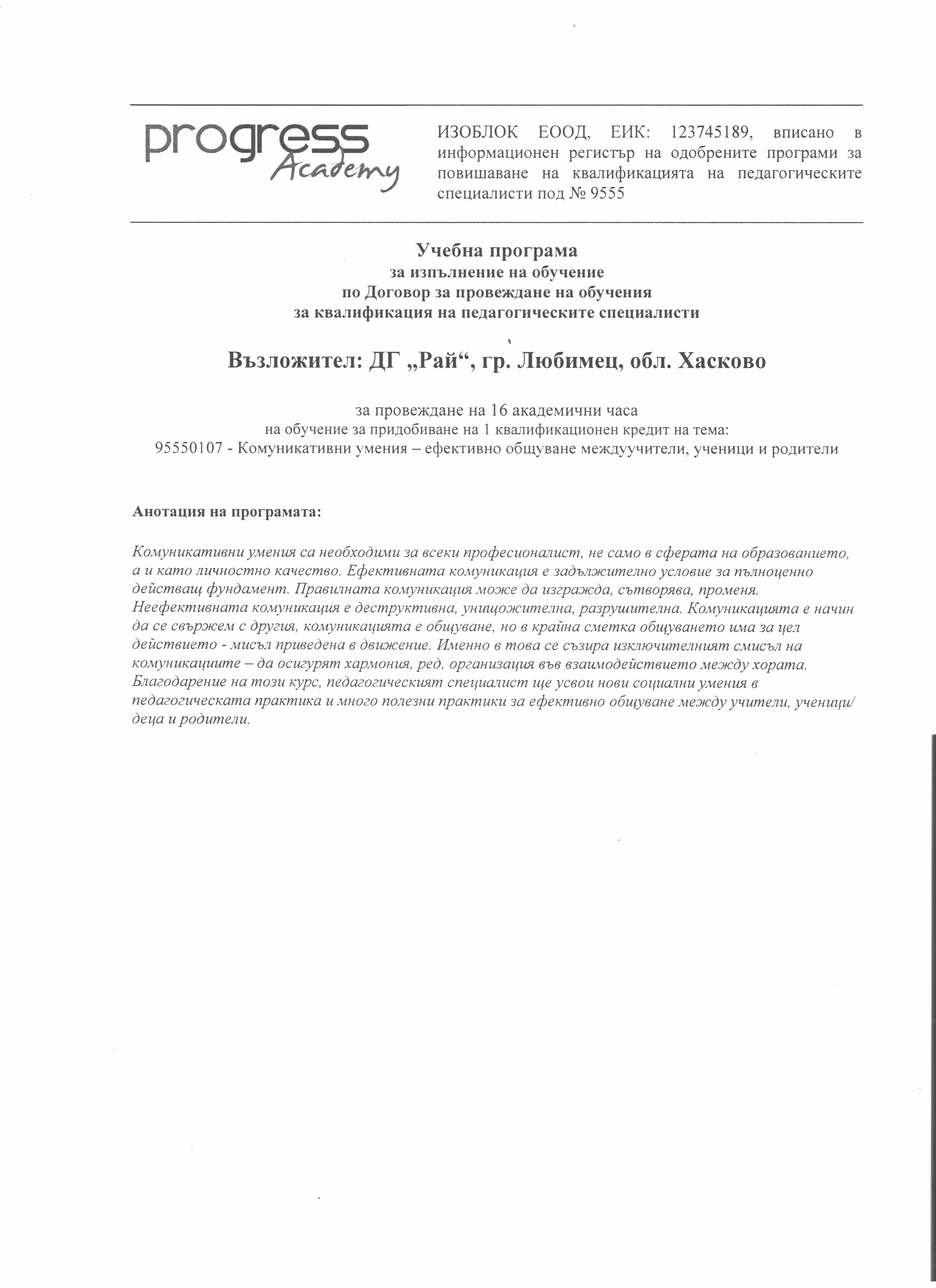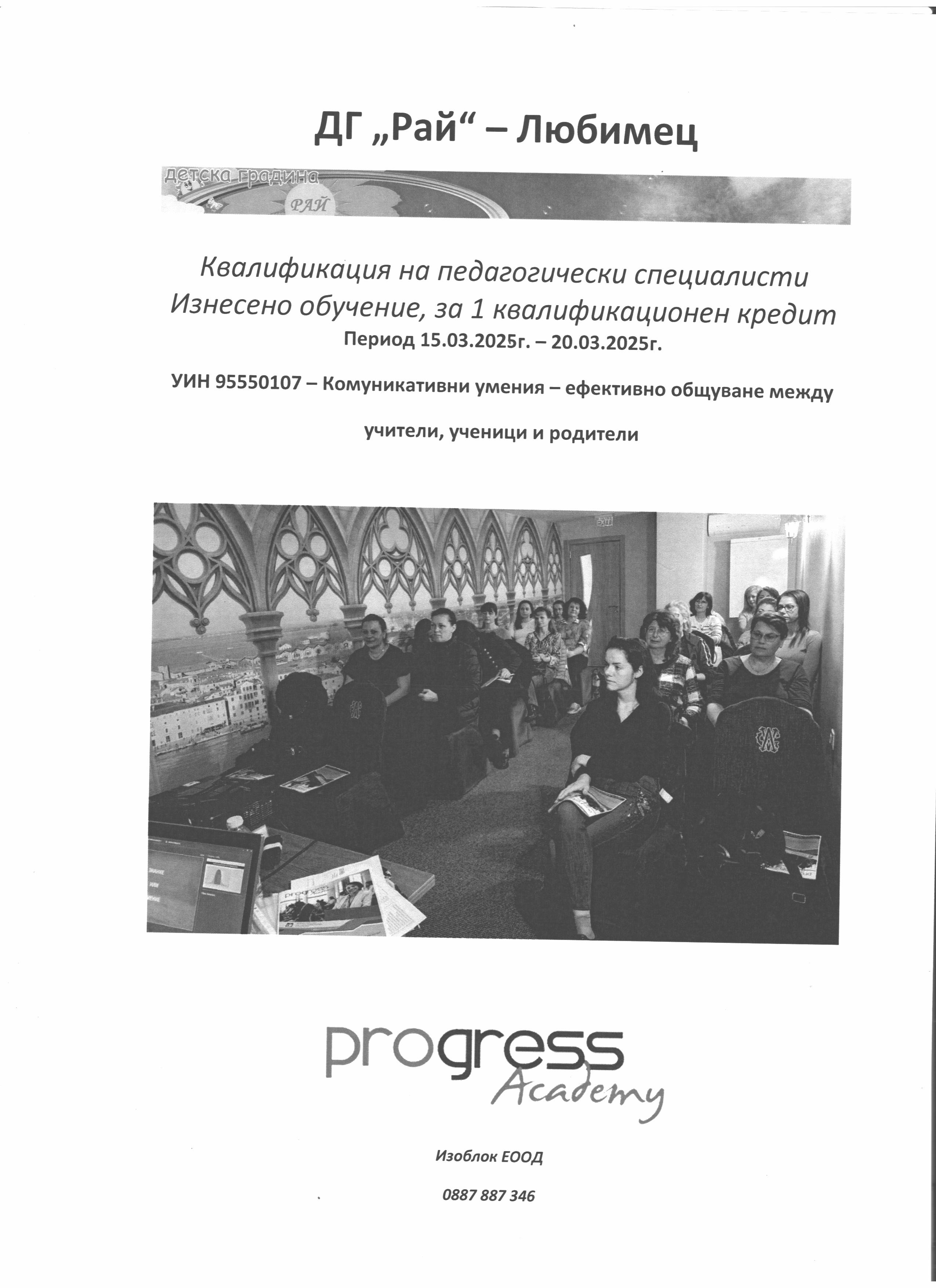 В периода 15.03.25г. - 20.03.25г. педагогическите специалисти на Детска градина "Рай" взеха участие в обучение на тема: Комуникативни умения - ефективно общуване между учители, ученици и родители.